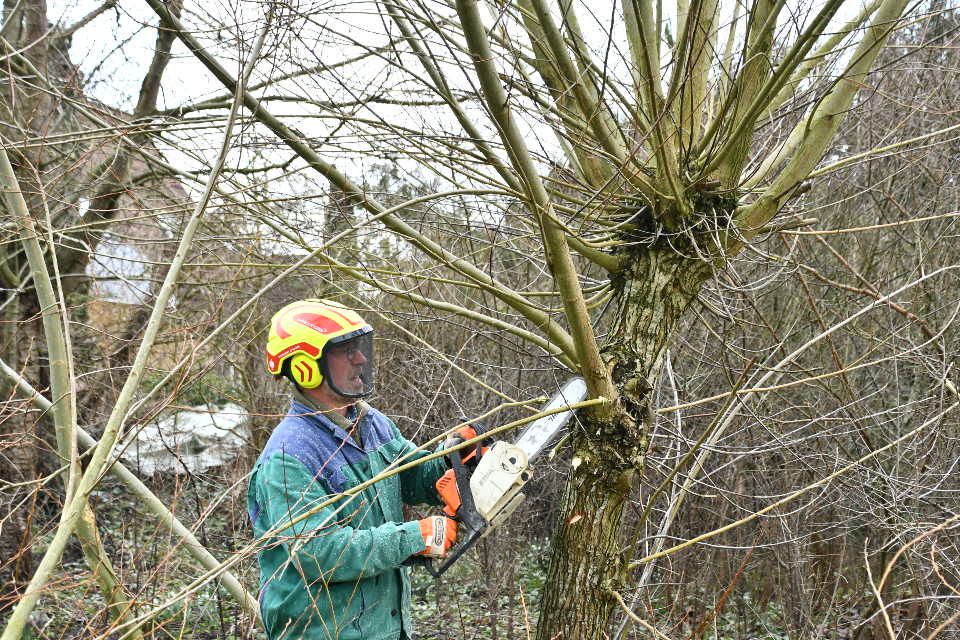 Laute Motorengeräusche sind im Bürgerpark westlich vom Erlengrund zu hören. Sie stammen von der Motorsäge, mit der Hans Fürst den Winterschnitt an den Kopfweiden durchführt. Hans Fürst ist Mitglied des Arbeitskreises Umweltschutz Gettorf e. V. Die Kopfweiden stehen am Rand der beiden Grünlandflächen, die sich im Besitz der Gemeinde Gettorf befinden. Im Einvernehmen mit der Gemeinde kümmert sich der Arbeitskreis seit rund sieben Jahren um die beiden Flächen. Die Naturschützer brauchen einen langen Atem, bis sich die früher als Pferdeweide genutzte artenarme Fläche in ein artenreiches Grünland entwickelt und Lebensraum für heimische Blütenpflanzen bietet.
